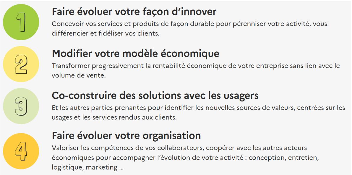 - économiques : avoir une approche centrée usagers plutôt que la vente d’un simple produit pour pérenniser son activité, se différencier et fidéliser ses clients ;