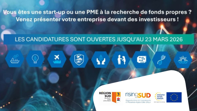 Cette séquence propose de mettre en relation les start-ups et PME des 9 OIR en phase de levée de fonds avec des investisseurs privés et publics, régionaux et nationaux. Pilotée par risingSUD, l’agence d'attractivité et de développement économique de la région Sud Provence-Alpes-Côte d’Azur, cette séquence s’inscrit par ailleurs dans le cadre du programme EEN France Méditerranée qui couvre également la Corse.